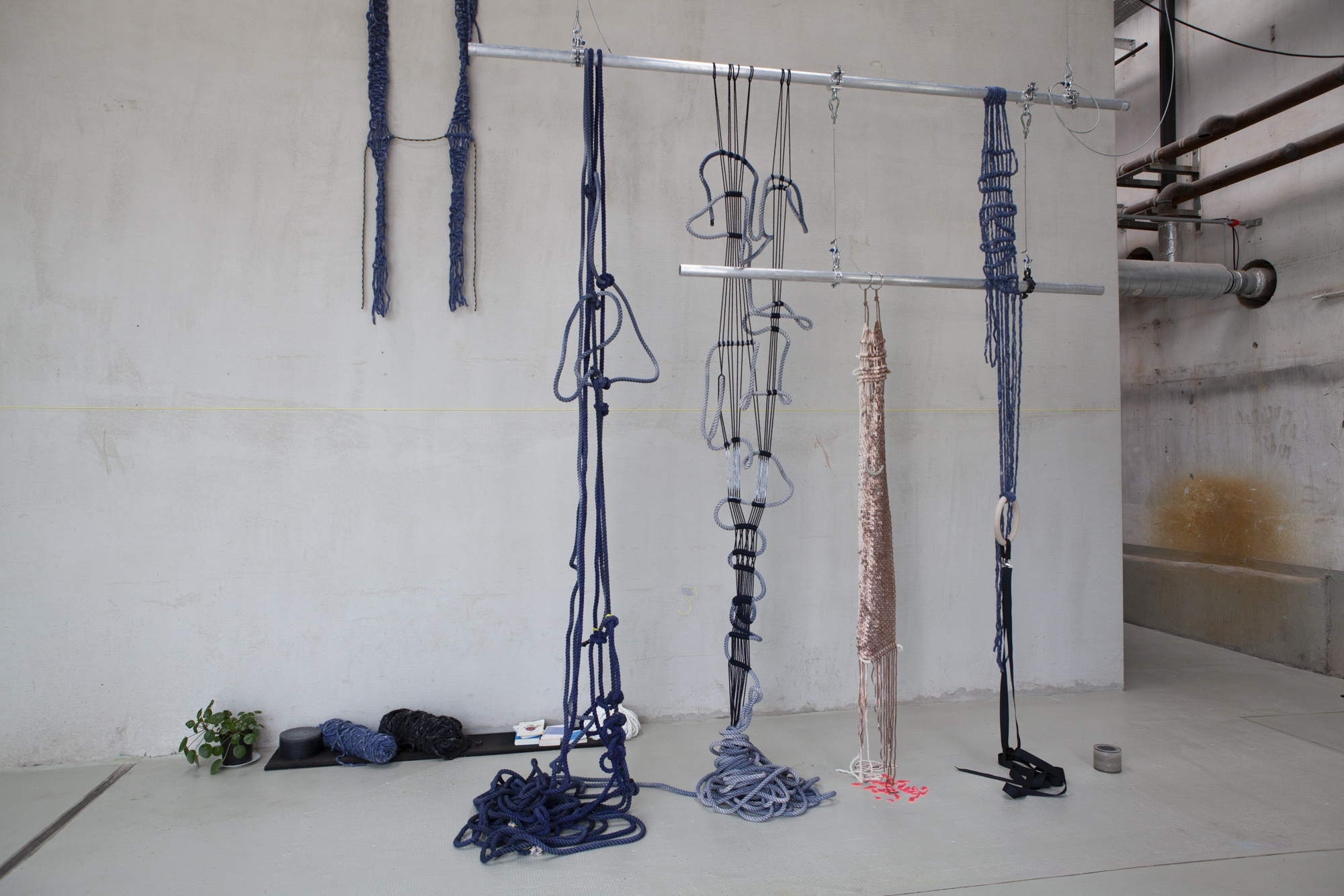 Five propositions on love, 2022 (dyed ropes, felt, epoxy, wood, theater traverses, books)